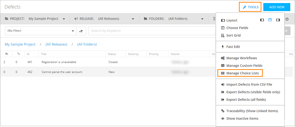 3. In the Select Item Type drop-down list, select Defects. Use the Select Folder and Select Item Title lists to navigate to the needed defect.