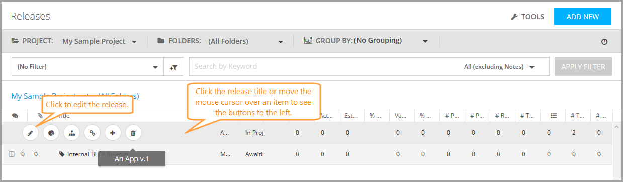 1. To open the Edit Release field, click the title of the release or the Edit this record button to the left of the needed release.