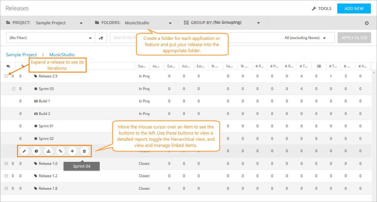 If your team is using Agile, we recommend creating a folder for your application or product in Releases, then create a release with iterations for each sprint.