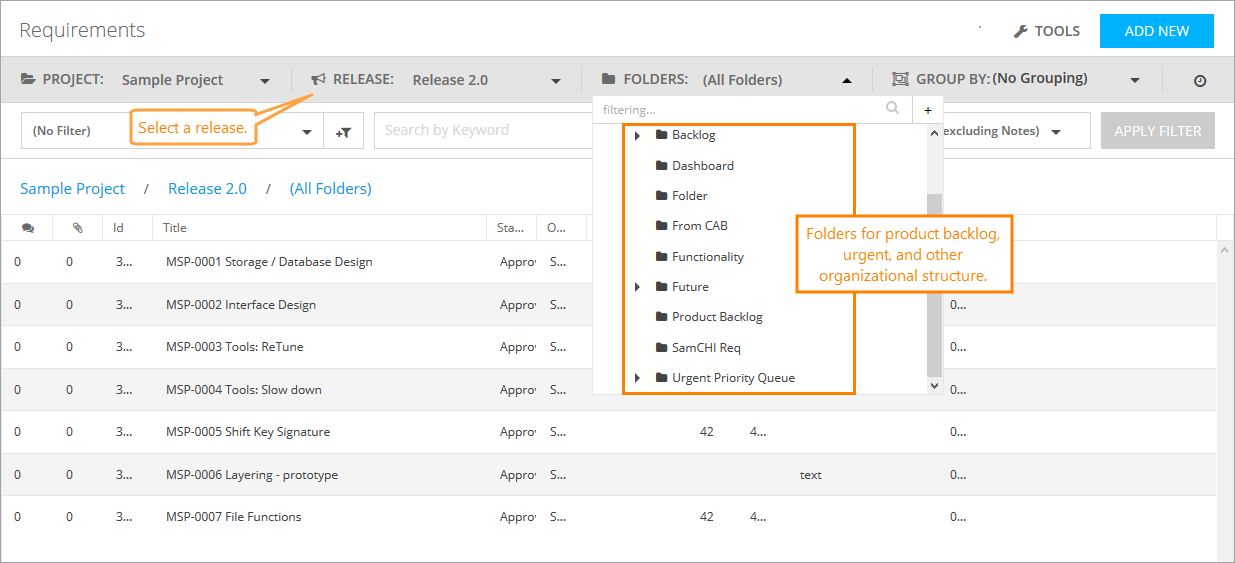 You will also need to keep track of future requirements. For that purpose, we suggest creating a Product Backlog folder in Requirements.