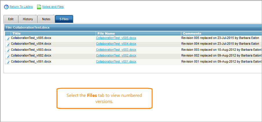If you are versioning documents, the new versions are attached to the original files and are numbered.