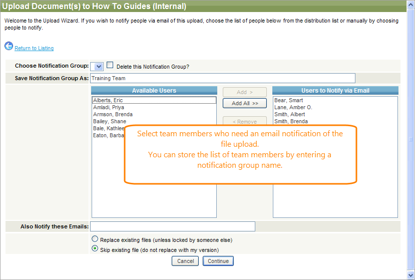 To upload documents, click Shared Documents, choose a folder, and then click Upload Wizard at the top of the screen. Windows Internet Explorer users can upload files using the drag-and-drop operation (click Actions > Turn Drag and Drop Upload On).