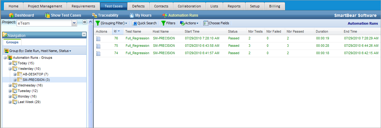 After the end of the automated test run, you can view the results in Automation Runs.