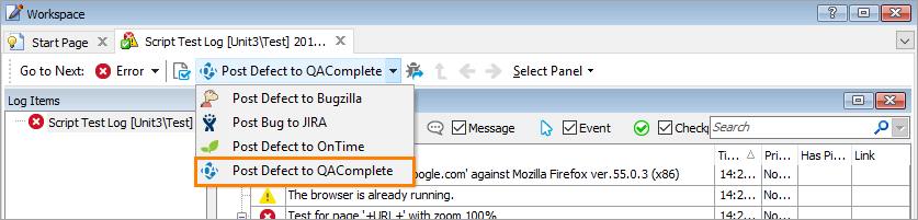 The Post Defect to QAComplete item in the TestComplete log