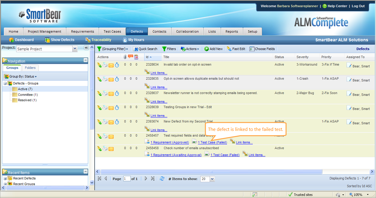When you run tests, use Automatically Generate Defect Upon Failed Test Case. When the test case fails, Software Planner searches for a link between the test case and requirement. If it finds a linked requirement, it links the defect not only to the test case, but also to the requirement.
