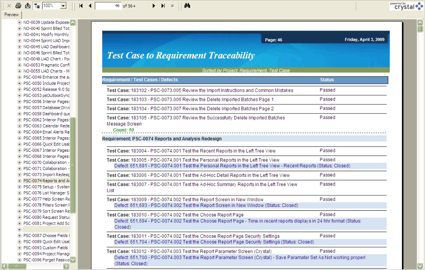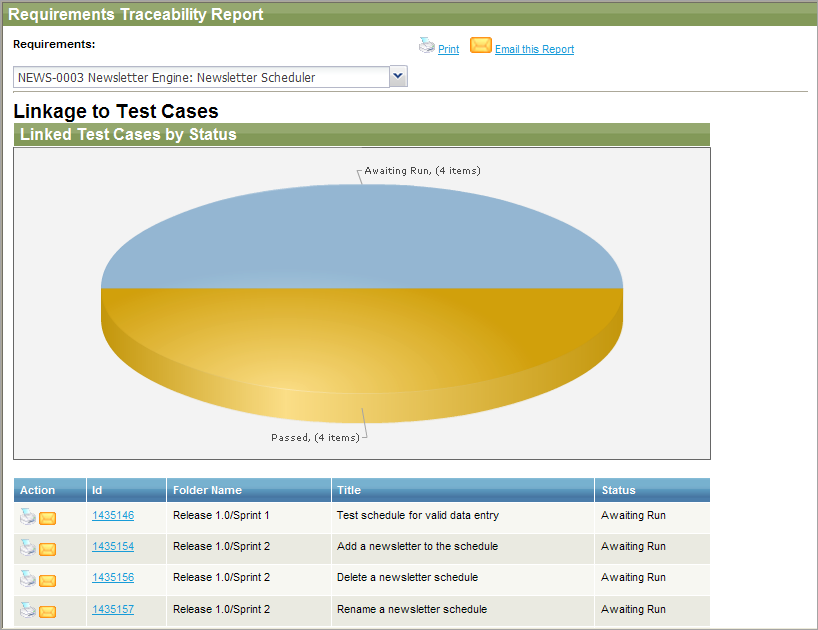 This report lists each requirement and all the associated test cases, including the current status of these.