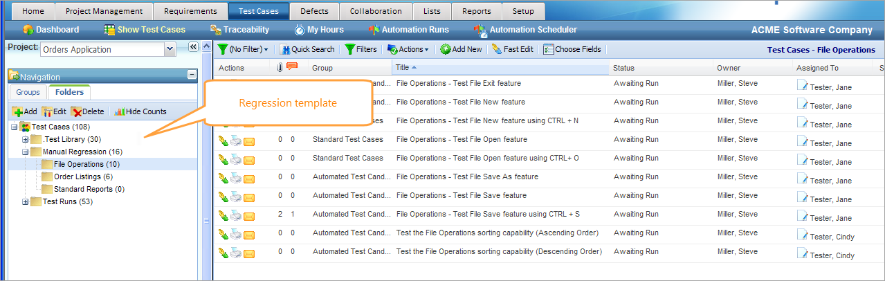 If your team is using manual test cases for regression, it is good practice to create a set of regression test cases that can be used from release to release. To do this, simply create a folder named Regression Template in Test Cases and store your regression test cases there. At the end of each release, it is good practice to review test cases for new features that were added in the subsequent release and convert test cases from that release to your regression set.