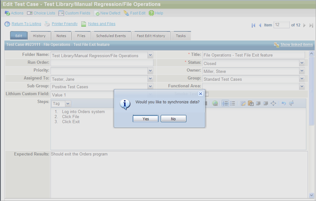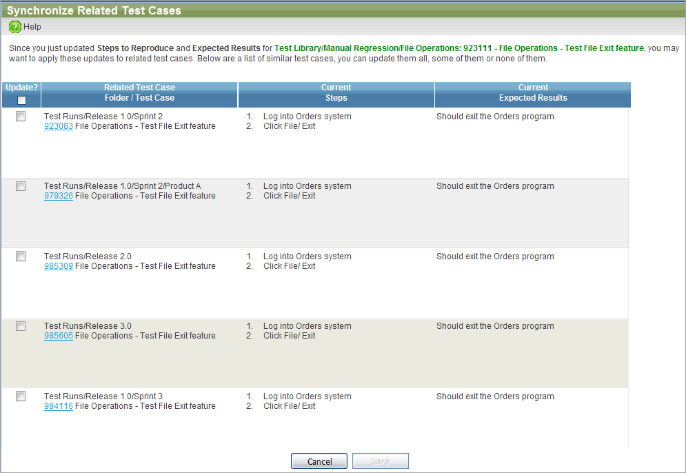 Tip: If you need to apply changes to steps or expected results in the Test Library, Software Planner will recognize which test cases in the release folders are related to the Test Library items and ask you whether you want to synchronize.