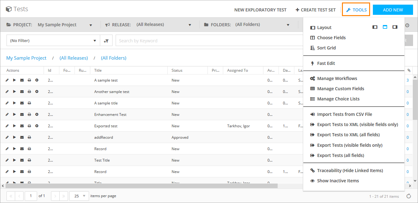 Click  Tools to perform various actions on the Test Library screen: