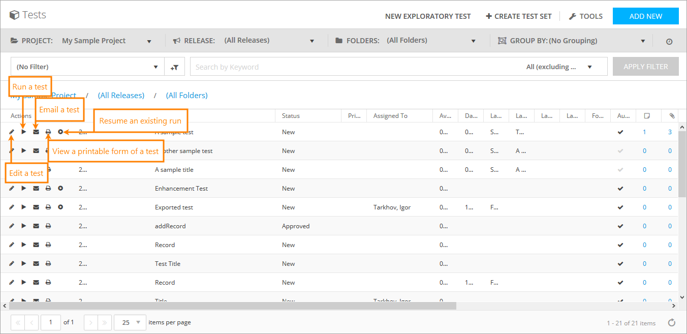 Use the buttons next to the needed test row to perform various actions: