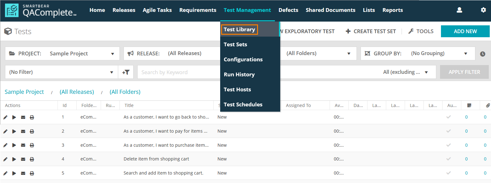 To access this screen, select Test Management > Test Library on the main QAComplete toolbar.