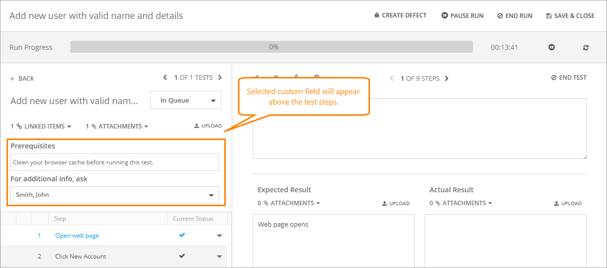 Now, when you run the test (either from the Test Library or as part of a test set), the custom fields will appear to the left, above the test steps: