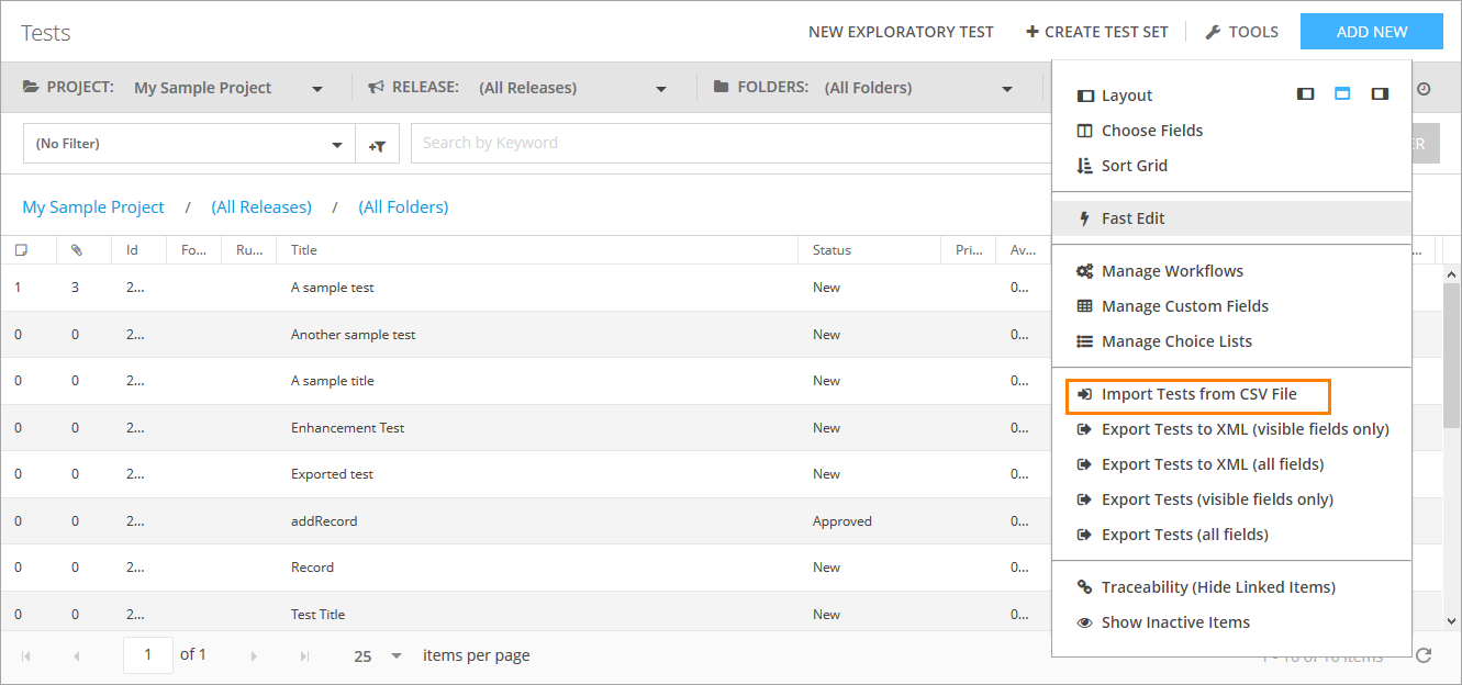 To import this file into your Test Library, go to Test Management > Test Library. Click  Tools and select  Import Tests from CSV file.