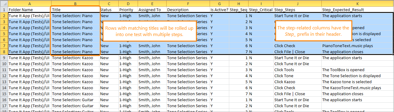 As the import reads this example, it recognizes that rows 2 through 8 belong together because the title and all test-level details exactly match from row to row. The test-related rows are combined into a single test, and the steps are added to the test.