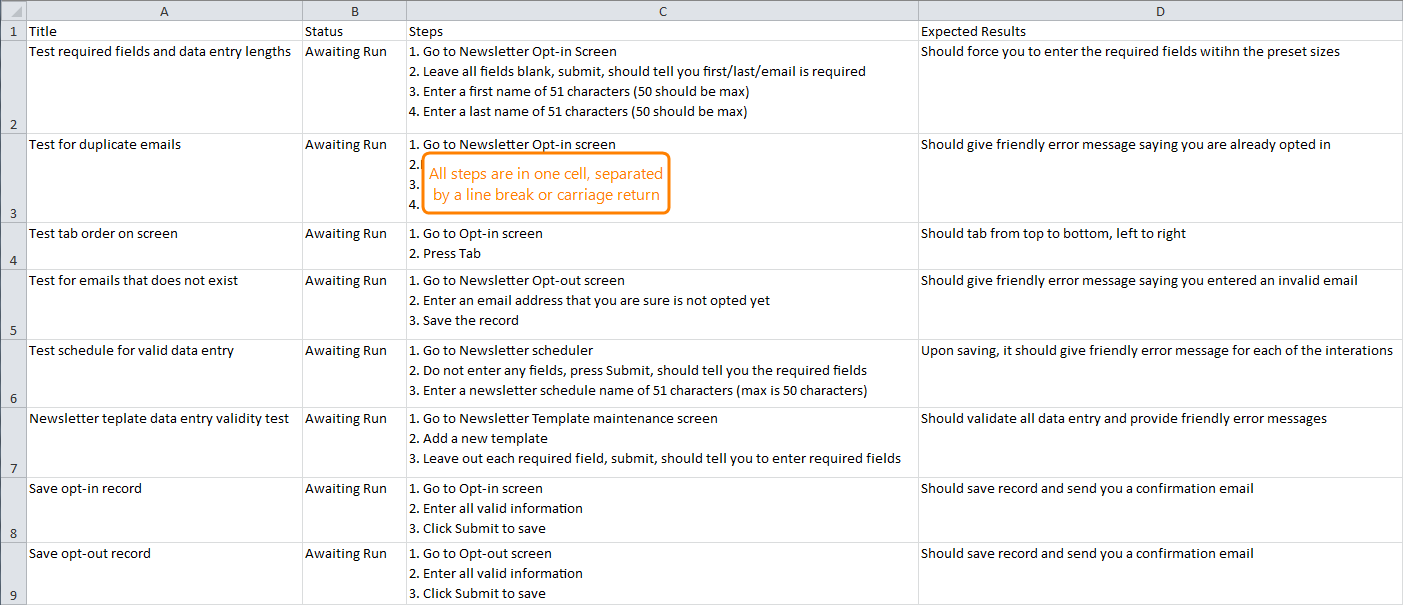 • Each row represents a single test, with steps in one cell.