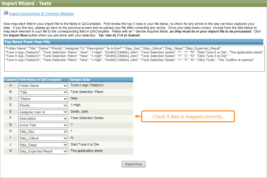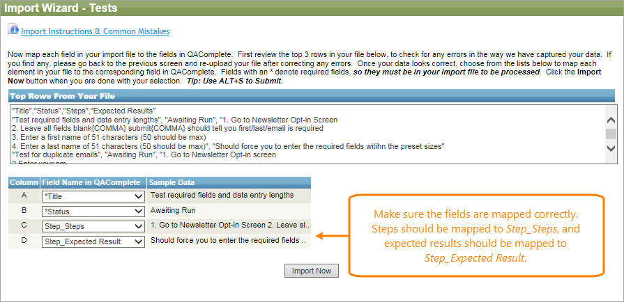 Browse to your file and click Next Page. If your column headers match field names of the test, the import will map the column to the field name. Use the drop-down list under the field name to map any columns that were not automatically recognized. Check the mapping for consistency, then click Import Now.