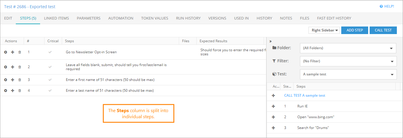 If test steps are combined in one field, this import profile will identify line breaks in the field and create separate steps within the new tests. Use this profile, if you are exporting a test from the Test Cases screen and importing into Test Management > Test Library.