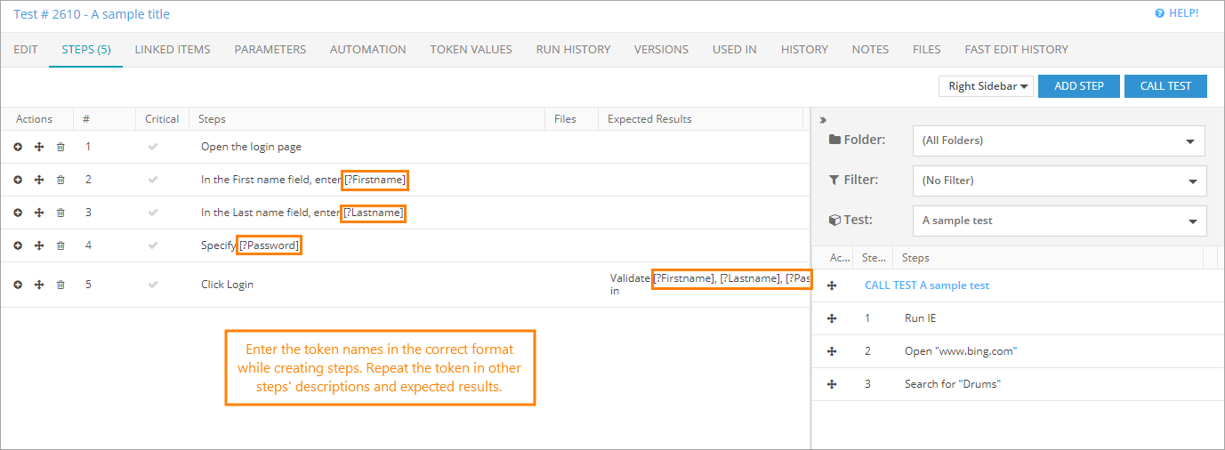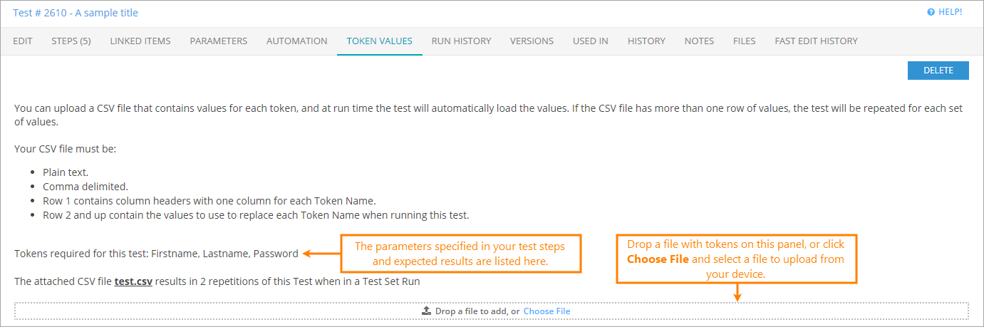 To repeat a manual test multiple times using different sets of input values, use tokens – distinctly formatted values in steps and expected results. By using the values from the attached CSV file of values, the Test Runner will build duplications of the test for each new set of values.
