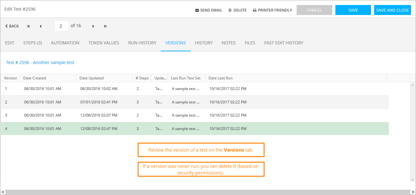 If you want to track all changes made to tests in your Test Library, you can turn on the test versioning. It allows you to store a complete historical copy of a test in your QAComplete instance as you make specific updates. You can review prior versions of your tests, revert to any selected version, and so on.