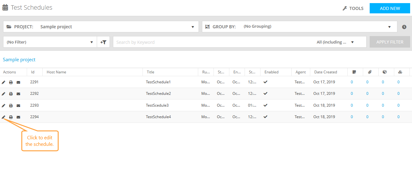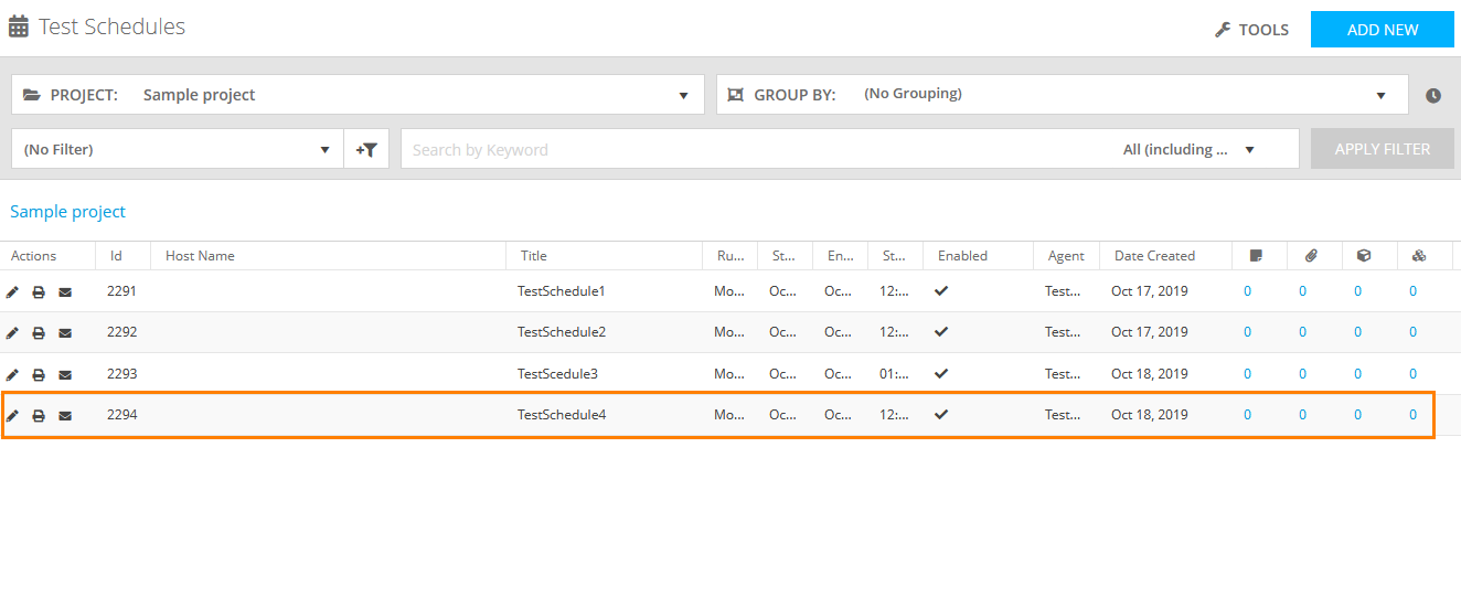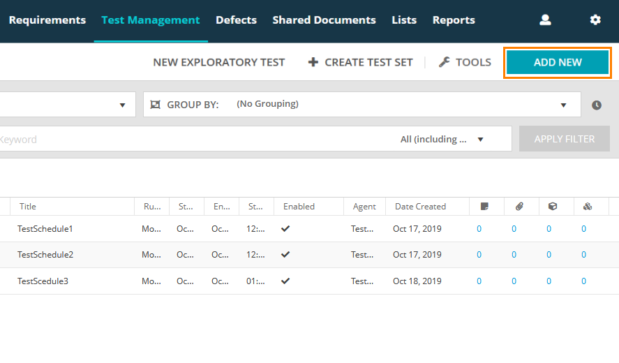 To create a test schedule, click Add New on the Test Schedules toolbar.
