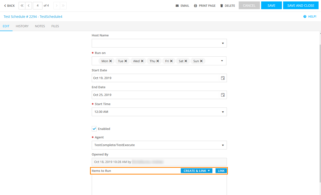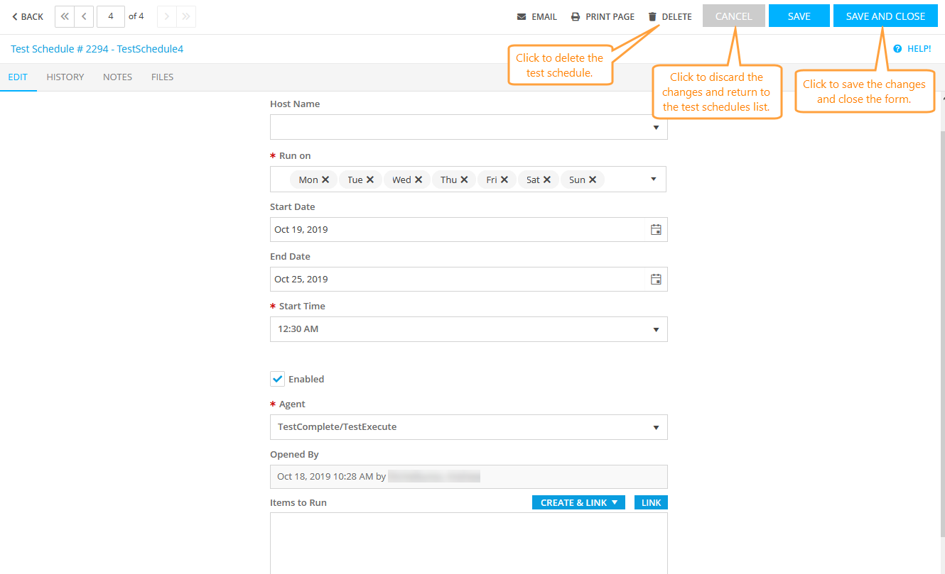 To view the history of changes of an existing schedule, switch to the History tab on the Edit Test Schedule form.