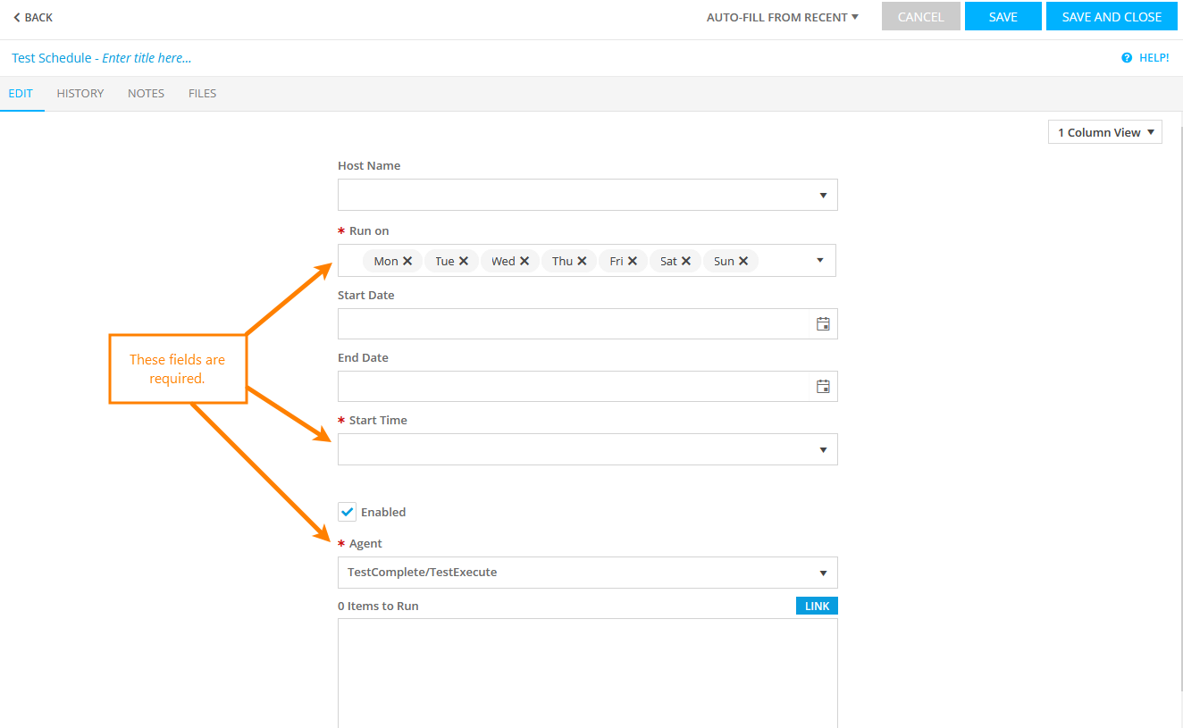 On the following Add Test Schedule form, provide the necessary information about a new schedule. You can use auto-fill to quickly describe the test schedule – to do that, just select a recent entry in the Auto-fill from Recent Entry drop-down list.