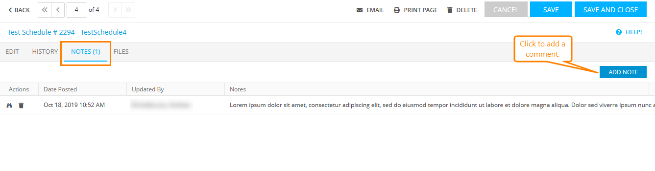 If you need to add some comments on the schedule, switch to the Notes tab on the Edit Test Schedule form and click Add Note.