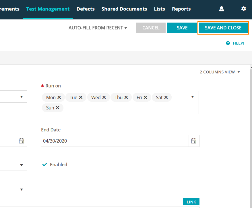 Once your test schedule is ready, click Save and Close to apply the changes and close the form.