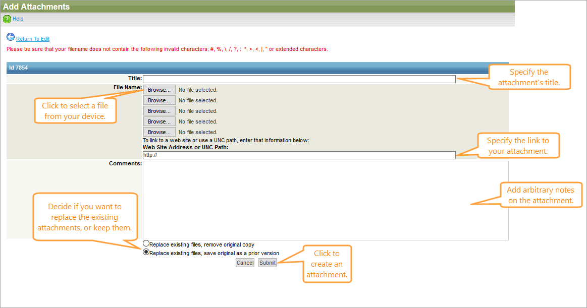 6. Click Submit to upload the file and return to the Edit form.