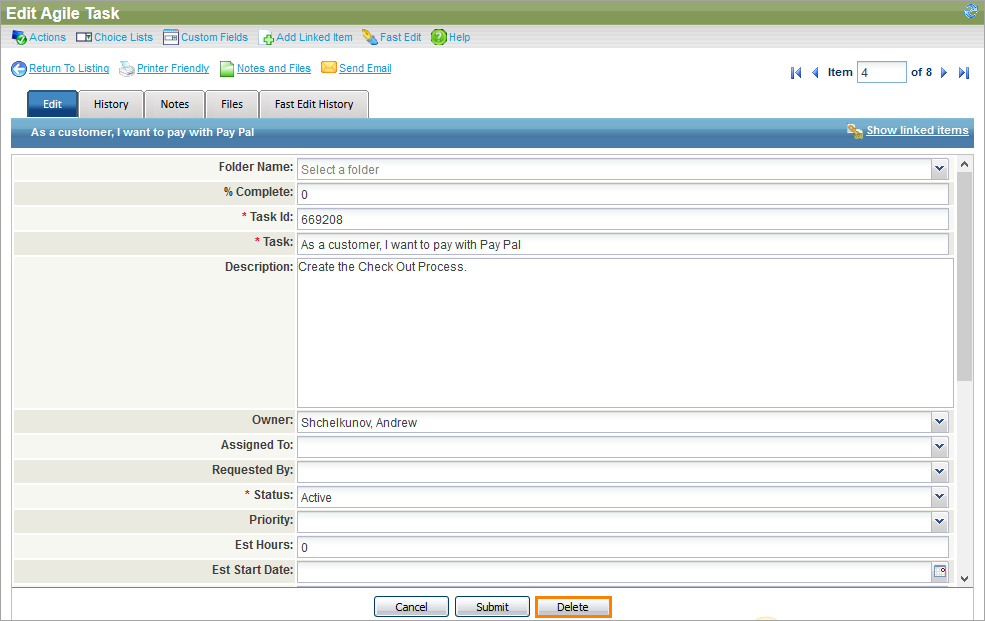 You can delete items from QAComplete only if you have the appropriate user permissions. This can be done from the Edit form: