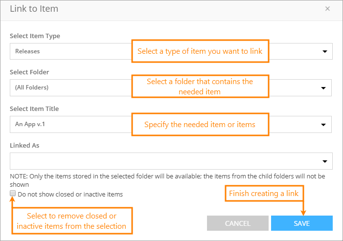 Tip: Unselect the Do not show closed or inactive items check box to create a link to closed or inactive items. -