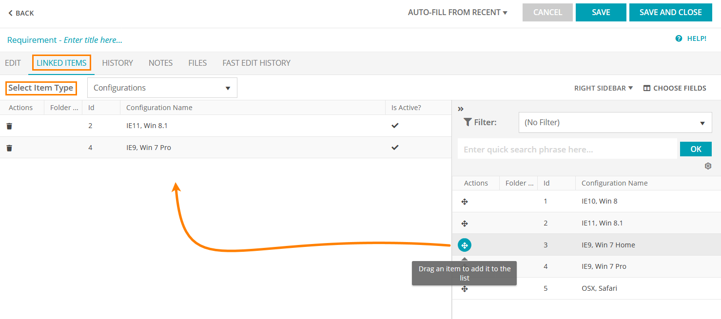 On the subsequent page, switch to the Linked Items page, select an item type, and drag items from the sidebar to the list on the left to create a link to the items of the selected type: