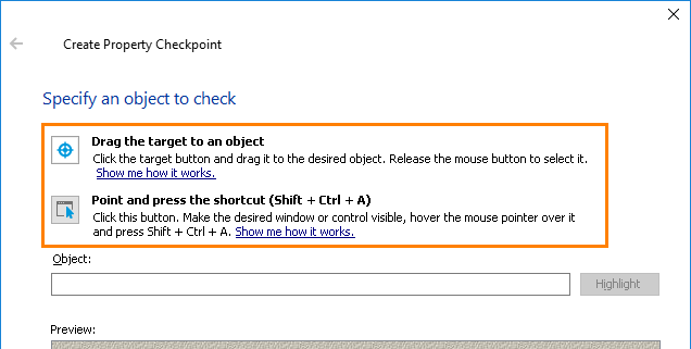 The most frequently used selection modes are “Drag the target…” and “Point and press a shortcut”. To understand how they work, click the Show me how it works links in the wizard or see the following topics: