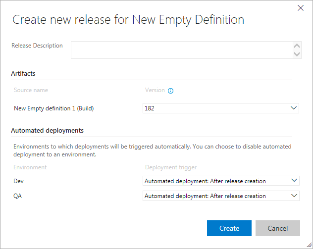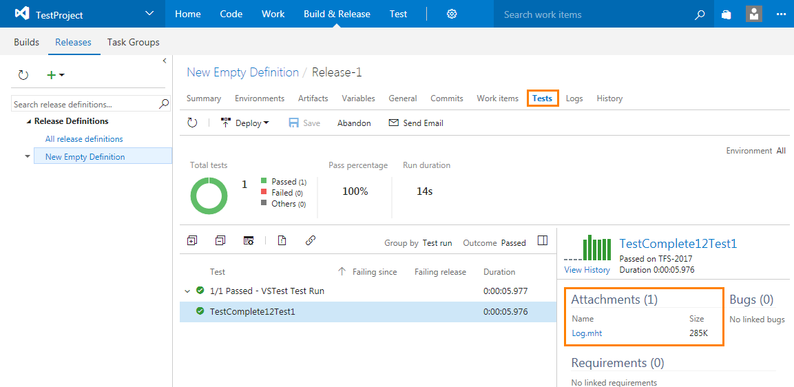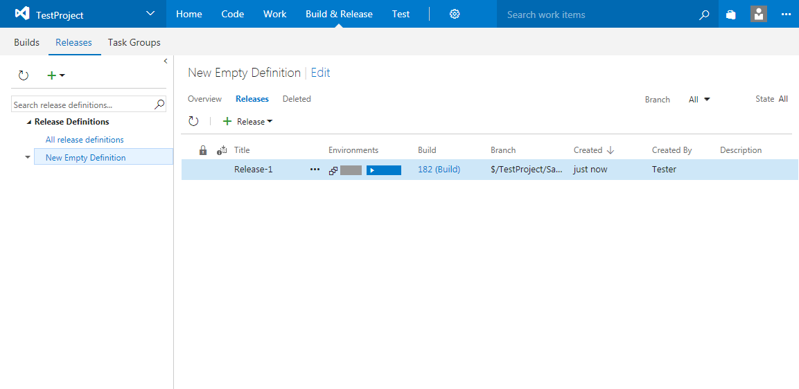 After you have configured a release definition, you can create a release for a build. Your TestComplete tests will run during the release deployment.