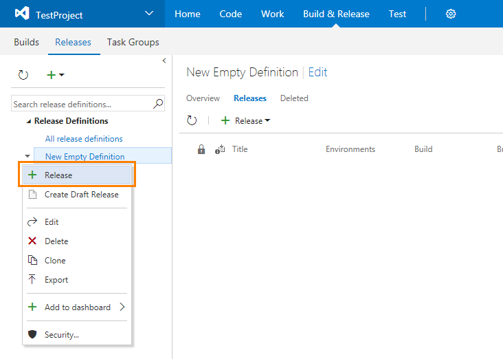Navigate to the Releases page of the Build & Release hub.