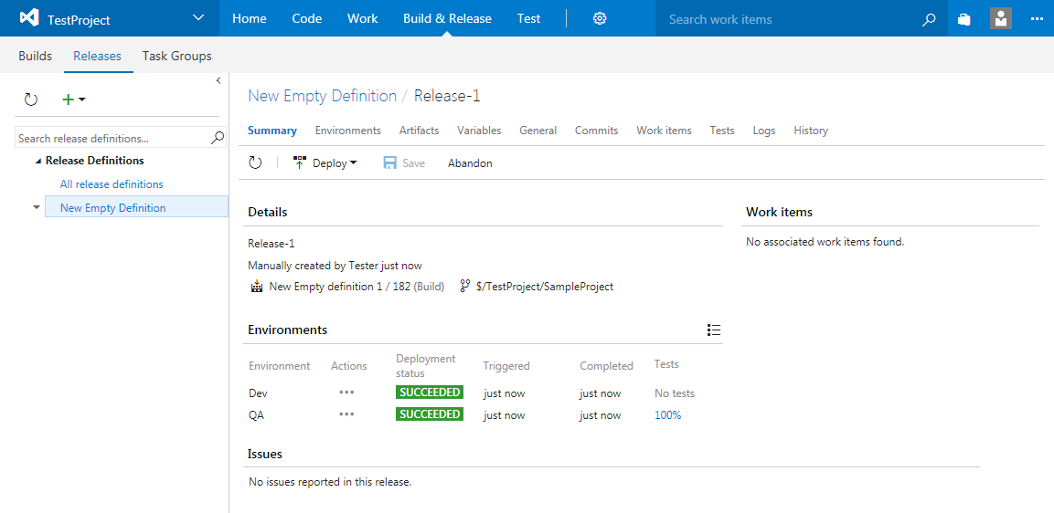 On the Releases page, view the release status. You can click the release to view detailed information on the deployment status of each of its environments: