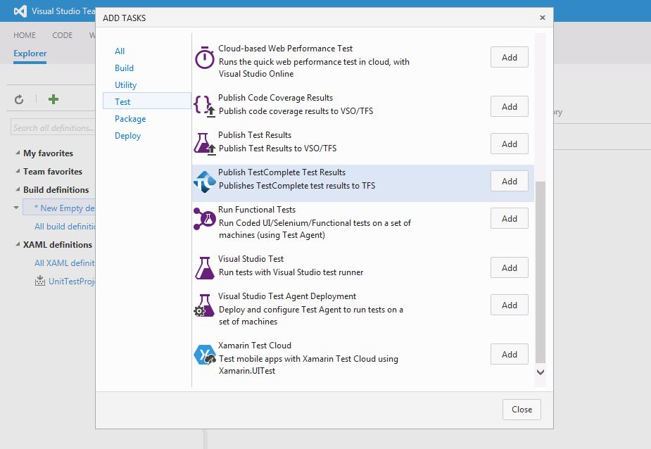 Open a build definition that runs your TestComplete tests. To learn how to create such a definition, see Running TestComplete Tests by Using Visual Studio Test Task.