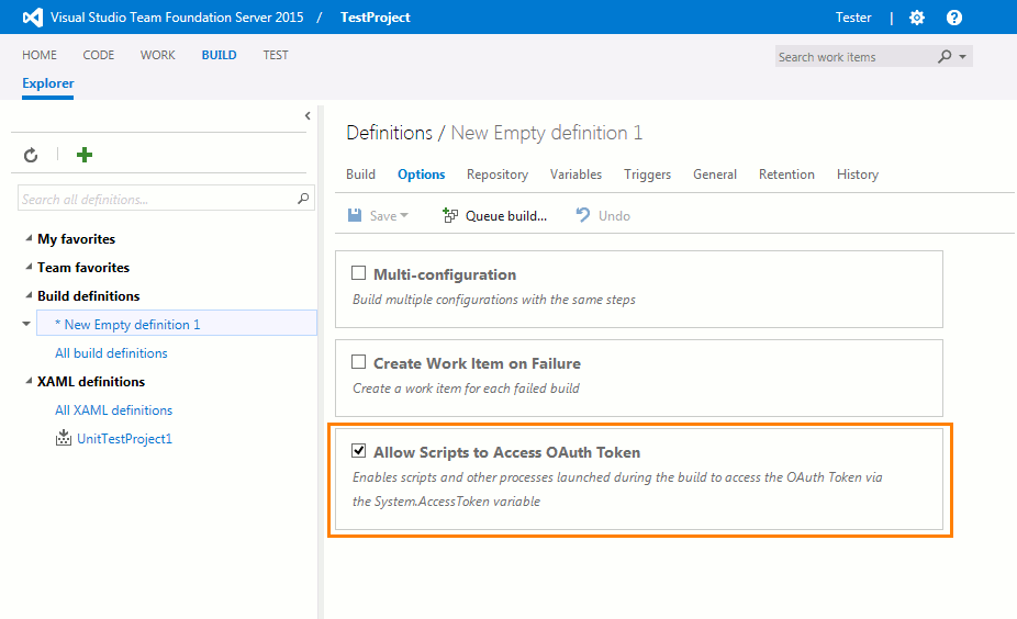 Configure the build definition to allow processes and scripts launched during the build run to access the OAuth token: