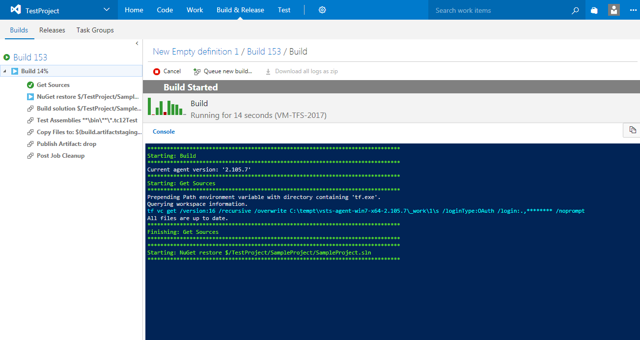 Queue the build. The build will be added to the build queue and the Build Explorer panel will inform you about the build progress: