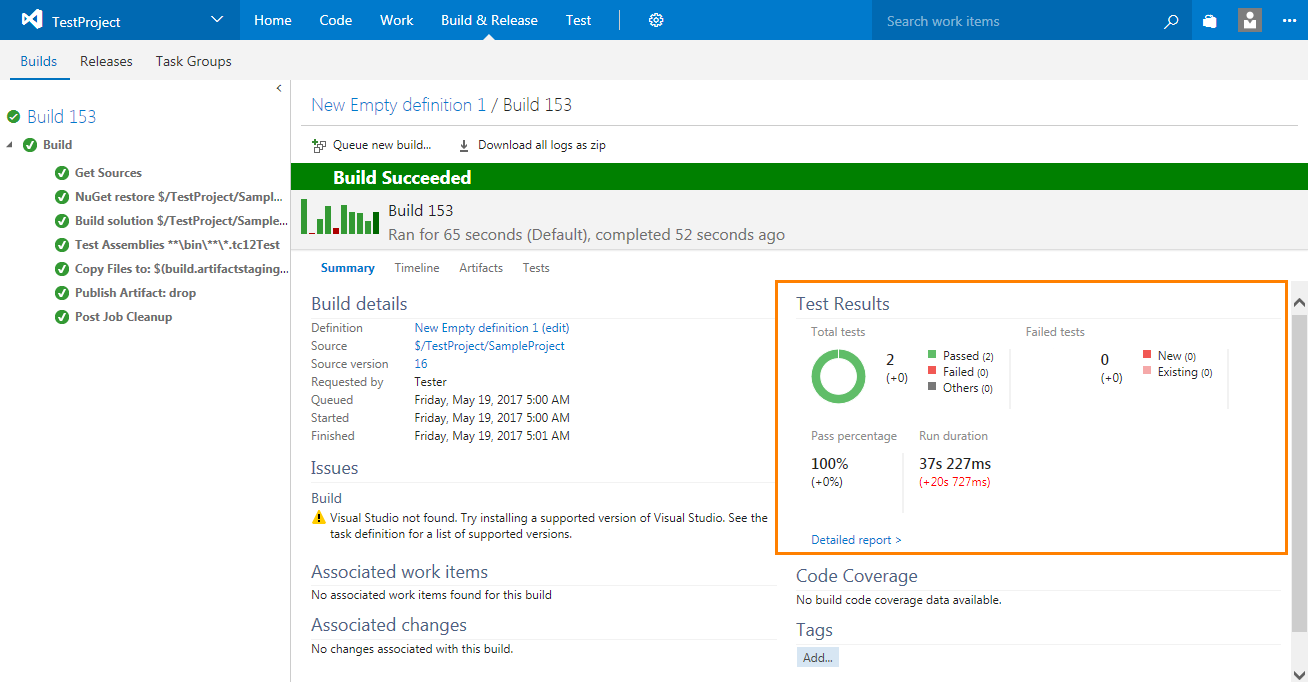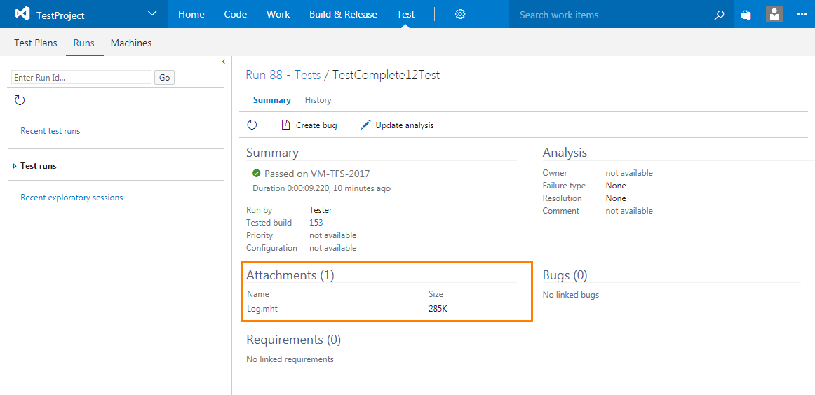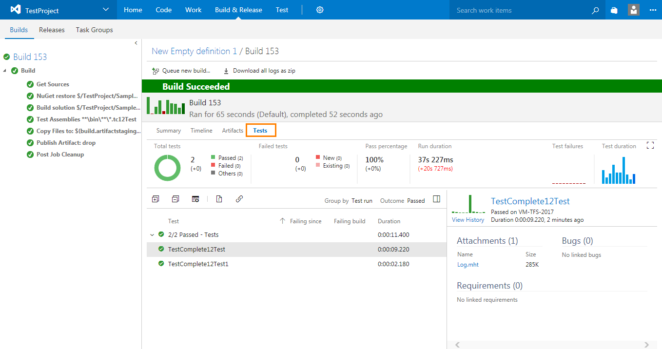 Note: If you run TestComplete tests by using Visual Studio Test task version 1, you need to publish TestComplete test results to view them on the Tests page. -