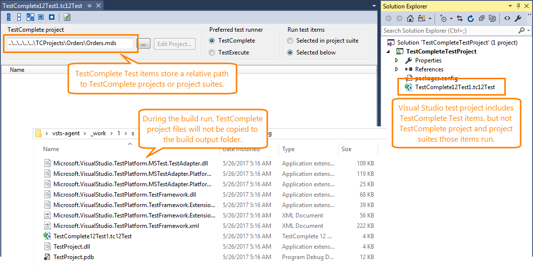 When you build your project on a build computer, TestComplete 12 Test item files (.tc12test) will be copied to the build output folder. However, TestComplete project files (.pjs, .mds and etc.) will not be copied to the output folder because they do not belong to the Visual Studio test project: