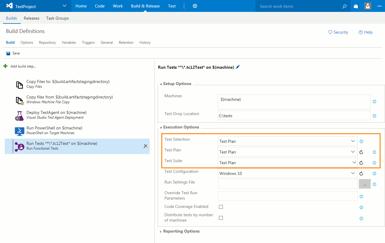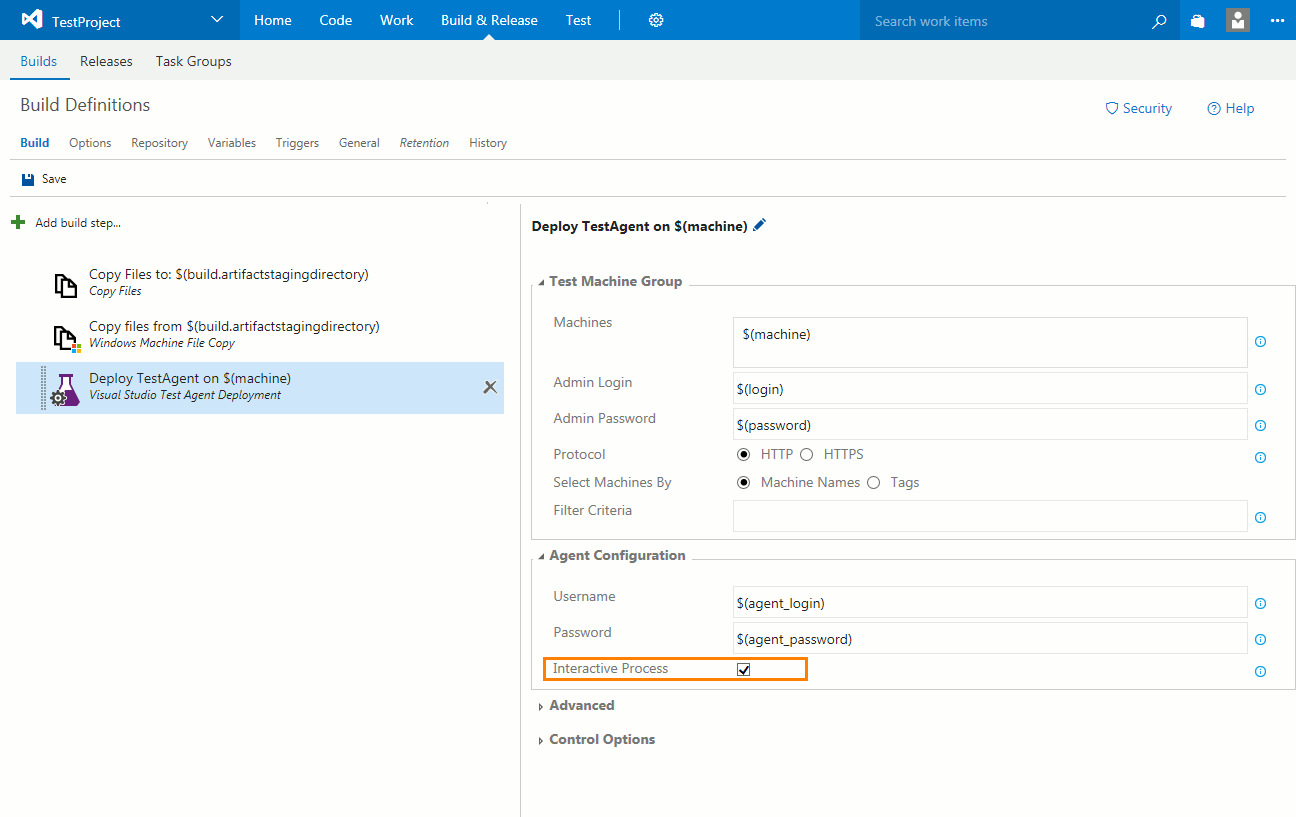 Configure your definition to deploy Test Agent for Visual Studio on computers where tests will run:
