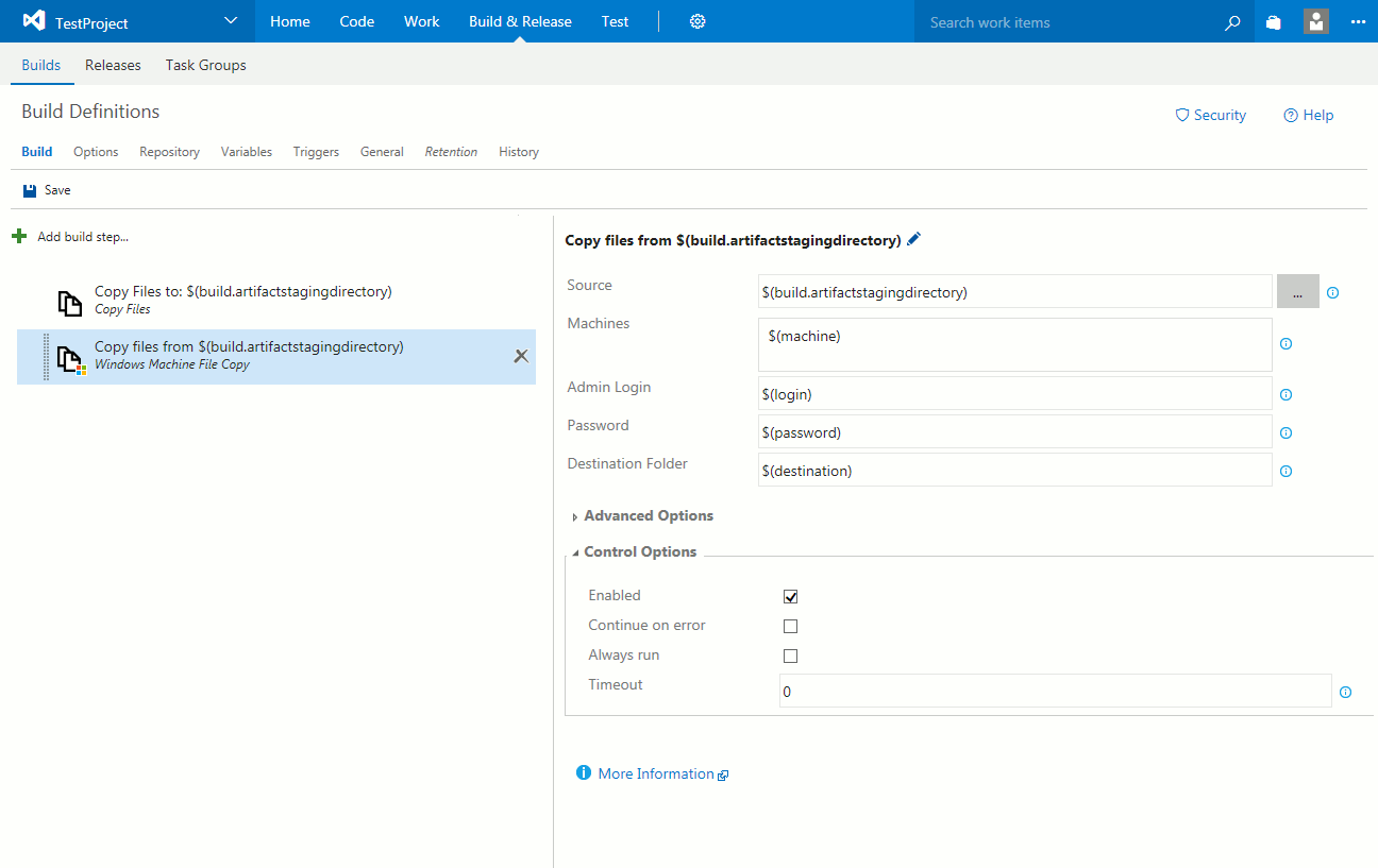 Configure your definition to copy your TestComplete tests from build output folder to computers where tests will run. For example, you can use the Windows Machine File Copy task to do this: