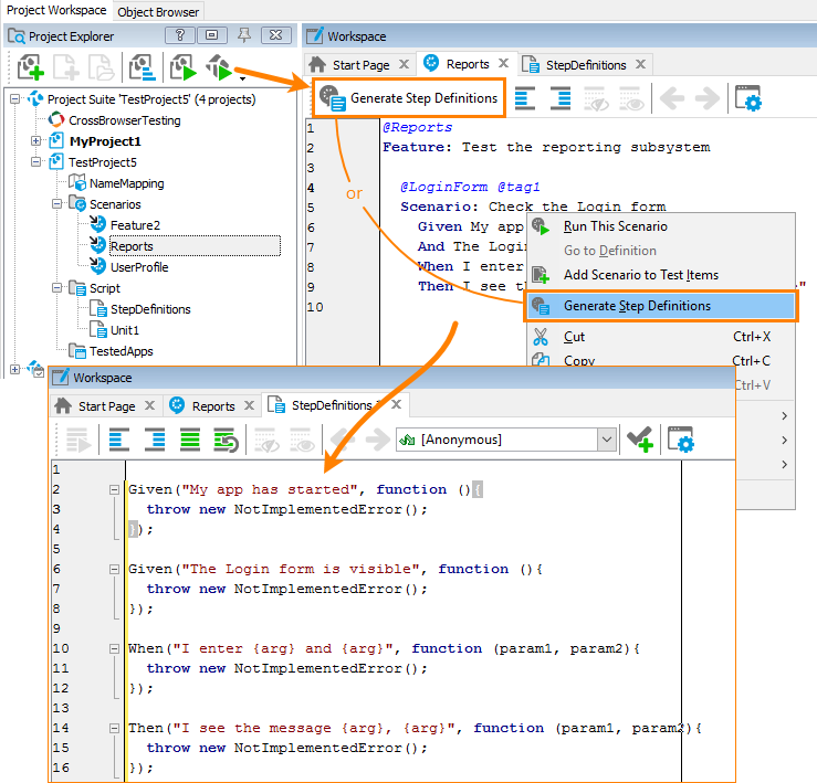 • After you create a feature file or import it to TestComplete, click Generate Step Definitions to command TestComplete to create script functions that will implement a step. You will then see the created code in the script editor. For instance, here is how the steps look like in JavaScript: