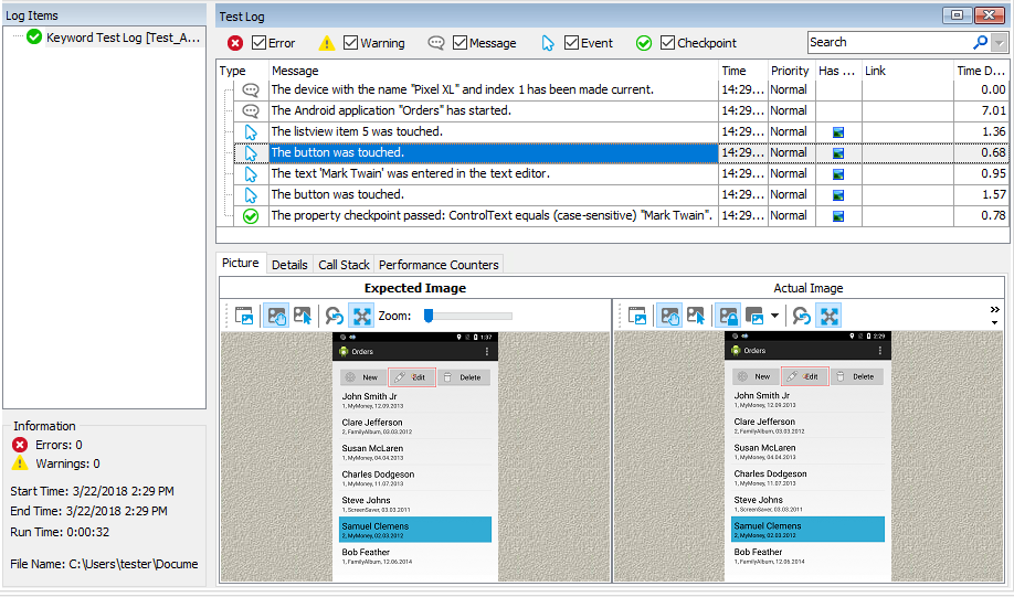TestComplete keeps a complete log of all operations performed during testing. The links to test results are shown in the Project Explorer panel under the Project Suite Logs | AndroidOrders Log node. This is the primary workspace for looking up the test history of the project and project suite. Each node corresponds to a test run. An image to the left of the node specifies whether the corresponding test run passed successfully: