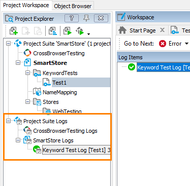 TestComplete keeps a complete log of all operations performed during testing. The Project Explorer keeps the test results under the Project Suite Logs > SmartStore Log node. This is where you are viewing the test history of the project and project suite. Each node corresponds to a test run. An icon to the left of the node shows whether the corresponding test run passed successfully: