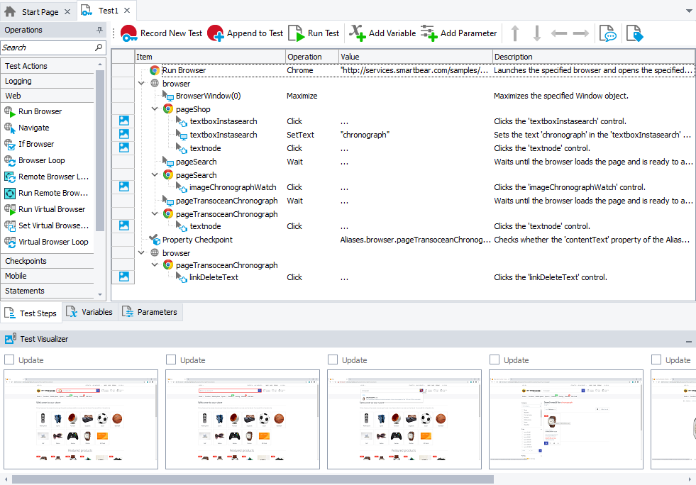 TestComplete will process the performed actions and generate a test. The test consists of the sequence of operations that define various interactions with objects in a web browser. For example, if you use keyword tests, your recorded test may look somewhat like the following: