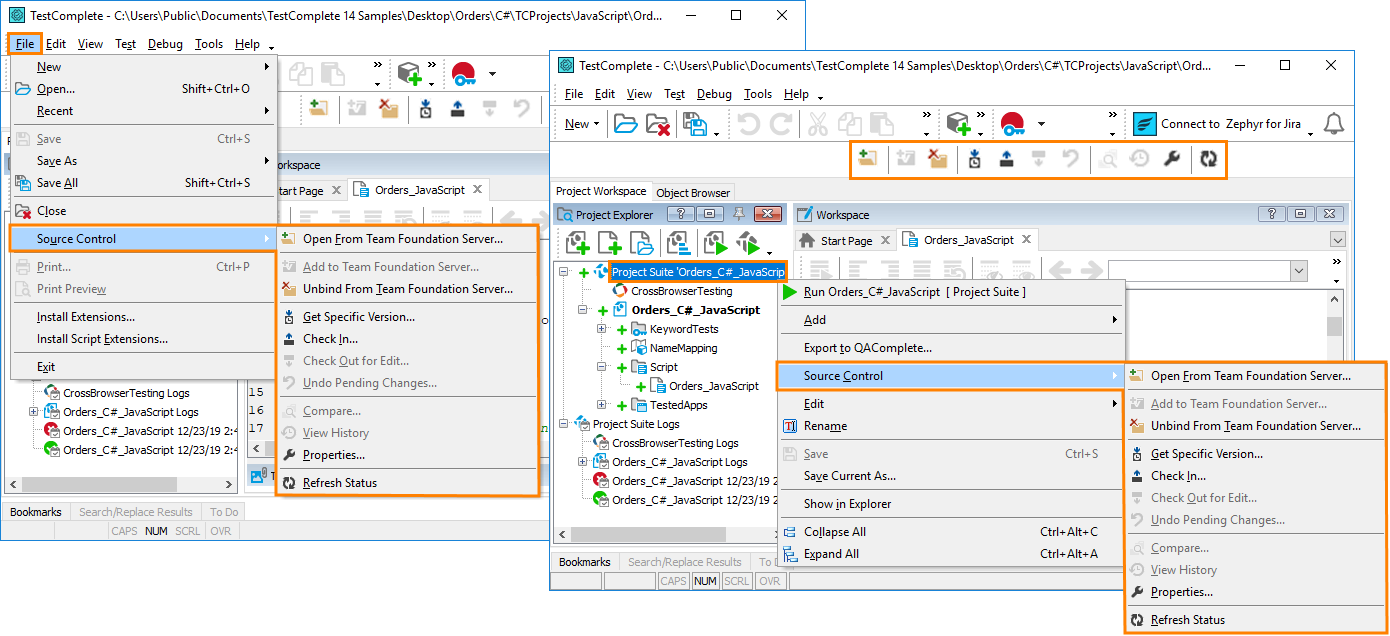 To work with source controls, you use special menu and toolbar items (see below). They help you perform typical actions easily.