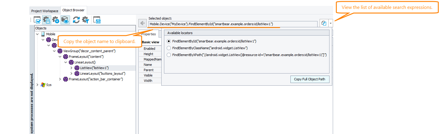 The easiest way to locate objects in your tested mobile application is to use the unique search expression that TestComplete provides for each object it recognizes in your tested mobile application. The Object Browser of TestComplete shows the list of available search expressions (if several expressions are available):