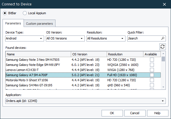 On the Parameters tab, select the mobile device and a tested application for which you want to open a testing session.